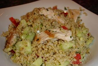 5. Mélangez le boulgour, le poulet, la tomate, le cocombre, l'oignon et la menthe dans un grand saladier