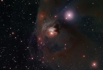 Magnifique vue de l’étoile T Tauri dans la constellation du Taureau. Le télescope WYN de 3,5 m de diamètre à Kitt Peak nous la montre dans son chaudron de gaz et de poussières, la nébuleuse NGC 1555 appelée aussi nébuleuse de Hind (du nom de son découvreur John Russell Hind, en 1852). Distante de 400 années-lumière de notre système solaire, c’est une très jeune étoile. Semblable au Soleil dans sa prime jeunesse, elle est âgée de quelques millions d’années. En d’autres termes, nous sommes peu de temps après sa formation et ce n’est pas encore une étoile dans le sens classique. T Tauri est devenue depuis sa découverte, le nom d’une catégorie regroupant des étoiles variables dont la luminosité change du fait de la perte de matières aux pôles. Ces étoiles n’ont pas encore de fusion thermonucléaire en leur centre et brillent par l’action des forces gravitationnelles.