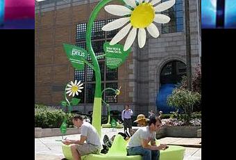 Toyota fait du Street Marketing green. Pour mettre en avant sa gamme de véhicules hybrides PRIUS, le constructeur automobile TOYOTA voit les choses en grand et en “green”, avec la mise en place de fleurs de plus de 5m de haut incluant des panneaux solaires, des stations d’accueil pour le rechargement de vos outils (mp3, téléphones mobiles, pc…), une base permettant de s’y asseoir et un accès WI-FI gratuit