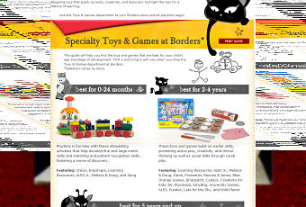 Eh bien Borders a fait de même : des jeux éducatifs et des jouets, pour les enfants, dans son secteur jeunesse, avec trois grandes tranches d'âge : 3 et moins, 3 à 7 ans et 7 à 12 ans. De quoi en offrir à chacun pour son plaisir. Attention, grand moment de bonheur : Borders explique que ses choix ont été effectués pour permettre aux enfants d'apprendre à devenir des lecteurs, mais aussi pour « promouvoir la diversité, favoriser la créativité et construire des expériences cognitives ». Du lourd !