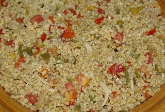 Verser sur le bourghoul le jus rendu des poivrons, le vinaigre et l'huile, ajouter la tomate et les poivrons pelés et coupés en dés avec leurs jus rendus, les oignons émincés et l'ail dégermé et écrasé, mélanger délicatement cette salade de riz