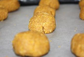 Former des petites boules, déposer sur la plaque du four recouverte de papier sulfurisé ou une feuille de cuisson en silicone et cuire pendant 10 à 12 min.