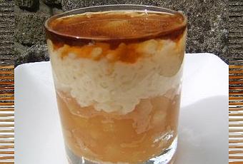 Riz au lait , son fondant de pommes caramélisées et son sirop d'érable Encore une très belle recette du livre de Nathalie Beauvais :Trop Mad Recette pour : 8 pers Préparation : 30 mn Cuisson : 1 h 30 mn A préparer la veille :Pour le riz au laitIl faut :100 g de riz rond 1 litre de lait cru entier 1 gousse de vanille 80 g de sucre semoule Pour le fondant aux pommes caramélisées Il faut :1 kg de pommes 80 g de sucre semoule 1/2 citron 6 cas de sirop d'érable ou " plus délicieux " du golden sirup Réalisation du riz au lait Rincez le riz sous l'eau froide et le mettre dans une casserole à fond épais avec 1/4 de litre de lait et la gousse de vanille " ouverte en deux dans le sens de la longueur Laissez cuire ainsi sur feu doux à découvert jusqu'à ce que le lait soit presque absorbé par le rizAjoutez les 3/4 de lait petit à petit tout en mélangeant de temps en temps Quand le riz devient compact " env 1 h de cuisson " , ajoutez le sucre et laissez cuire doucement pendant encore 10 mn Versez le riz dans un plat creux et mettre de coté au frais jusqu'au lendemain Préparation du fondant toujours la veille :Epluchez les pommes les épépiner et les tailler en quartiers Les mettre dans une casserole à fond épais avec le sucre et le jus de citron Laissez cuire ainsi à petit feu à couvert jusqu'à ce que les pommes soient fondantes Découvrir la casserole et laisser légèrement caraméliser la compote en la mélangeant régulièrement et toujours sur feu très doux " env 1 h de cuisson " Versez ce fondant dans un récipient et mettre de coté au frais jusqu'au lendemainDressage :Dans une coupe tranparente ou un verre , versez pour 1 pers une belle càs de fondant aux pommes , ajoutez 2 càs de riz au lait et pour finir , nappez chaque riz avec 1 à 2 càs de sirop d'érable Ce dessert certe tout simple est délicieux pour ses mariages de saveurs délicates