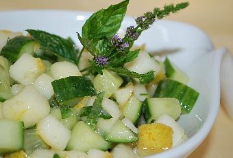 laver et couper le concombre, ne pas l'éplucher, couper en tranches d'un bon cm comme la poire, découper en cubes et mélanger les deux