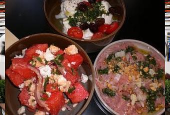 Et soudain, alors que l’extrémité de ce gigantesque espace laisse entrevoir la rue d’Aubervilliers, apparaît à gauche, discrète dans son renfoncement, une petite terrasse animée… des voix s’élèvent dans un léger brouhaha, les visages sont animés et des serveurs souriants, carnet à la main, dansent de tables en tables. Attablée sur du formica épousant la géométrie de tiges d’acier d’une époque révolue, je m’apprête à commander une formule trois entrées pour douze euros sur le menu hebdomadaire. Sous le parasol, je me délecte d’un carpaccio de veau relevé d’huile d’olive, de parmesan et de noisettes. Je plonge ensuite ma fourchette dans une coupelle accueillant une douce faisselle parsemée de croquantes et acidulées tomates cerise et olives noires. Puis je termine mon repas par la troisième entrée : une salade de pastèque légèrement sucrée contrastant avec le sel de la feta et la chlorophylle fraîche apportées par de la menthe ciselée…