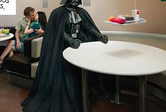 Aaaaah ! après un mois et demi sans parler de pub et en m'en éloignant complètement, l'émotion publicitaire, du juste-message, du juste-visuel m'a reprise inopinément devant cette affiche, j'ai souris. J'ai trouvé ça parfait pour McDo, simple, efficace, bien réalisé... J'étais déjà fan de la nouvelle baseline pondue par BETC pour l'enseigne au M jaune (désormais sur fond vert), "venez comme vous êtes", mais là, ces affiches l'expriment au mieux en s'adressant en plus au grand public (parce que bon le délire arty de la première phase avec le même visage transformé, je doute que la cible mcdo l'ait compris). J'aime beaucoup ici aussi l'opposition réalité-fiction entre le couple qui se galoche au fond (un mercredi avant d'aller au ciné ?!) et le personnage de Lucas au premier plan. Par contre je me demande quand même, comment est-ce que McDo a pu se payer les droits ?! Lucas est en plus hyper frileux et regardant sur l'utilisation des droits Star Wars, alors quoi ? c'est tombé dans le domaine public ou bien ?!
