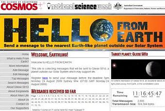 Le 1er magazine scientifique australien, COSMOS, soutenu par la NASA et le département de l'innovation, de l'industrie, de la science et de la recherche, vient de lancer un site web insolite pour célébrer la semaine nationale de la science. HelloFromEarth.net permet en effet aux internautes de rédiger de courts messages à destination de Gliese 581d, une planète située à 20 années-lumières de chez nous et où les éléments sont rassemblés pour y trouver la vie. Concrètement, votre message arrivera (peut-être) sur place dans... 20 ans ! Beaucoup d'incertitude autour de cette initiative, pas sûr d'obtenir une réponse, mais pourquoi ne pas essayer ? Si cette opération interstellaire vous tente, si comme près de 3000 personnes vous avez un message à faire passer à nos collègues de l'univers, ne tardez pas : le site fermera ses portes le 24 août 2009.
