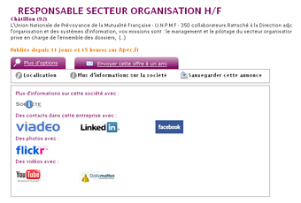 - Informations sur la société : générique (Societe.com), vidéos (via YouTube et Dailymotion), photos (Flickr) ou contacts sur les réseaux sociaux (Viadeo, LinkedIn, Facebook)