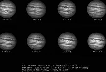 Voici deux jeux d’images de Jupiter représentant sa rotation avec l’ombre de l’impact… C’est très sympa de démontrer comment vos caméras DMK fonctionnent. Elles ont été prises avec la caméra noir et blanc DMK 21AF04.AS sur mon télescope SCT 10″ dans mon observatoire de jardin, à Dayton, Ohio, USA.
