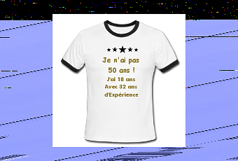 Rassurez-vous, je ne suis pas devenu « designer » durant mes vacances… Ayant découvert par hasard un site qui permet de créer et de diffuser ses propres créations de tee shirts et gadgets, je me suis d’abord amusé à créer un T-shirt pour celles et ceux qui, comme moi, fêtent leurs 50 étés cette année. Plusieurs modèles pour hommes et pour femmes sont d’ores et déjà disponibles avec le texte suivant : « Je n’ai pas 50 ans, j’en ai 18 avec 32 ans d’expérience. » Vous pouvez les voir en cliquant ici. Et d’autres modèles suivront… En fait, après la politique, je vais peut-être me reconvertir dans la confection… Ne riez pas ! (lol)
