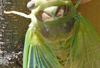 La perspicacité des enfants qui ont pris goűt au suivi du développement des cigales ont pris sur le fait, une cigale "verte" qui venait de muer en quittant sa chrysalide...