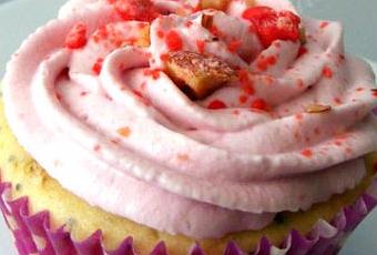 6. Une fois les cupcakes refroidis, coiffez-les de crème chantilly à l'aide d'une poche à douille cannelée ou lisse puis parsemez de pralines concassées.
