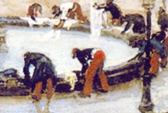 "Dans ce pittoresque espace abrité par de grands arbres du château des Brouillards, c'était le voisinage de l'abreuvoir, qui le soir s'anime du spectacle de chevaux et de chiens que l'on y baigne (...) et d'une fontaine construite dans le goût antique, où les laveuses causent et chantent comme dans les premiers chapitres de Werter. Avec un bas-relief consacré à Diane (....) à l'ombre des vieux tilleuls qui se penchent sur le monument qui rappelerait à ses heures certains points de la Campagne romaine" La Bohème galante. Gerard de Nerval ...... Le Château d'Eau de la place Ravignan (aujourd'hui place Jean Baptiste Clément) : C'est en 1835 qu'une tour octogonale fut édifiée près du rendez-vous de chasse ayant prétendument appartenu à Catherine de Médicis. Ce réservoir fut surelevé, et en 1860 il fut alimenté par les eaux de la Dhuis. Un autre réservoir fut construit en 1888 presque sur les flancs de la basilique. Des sources coulaient sous terre, rue Ramey, passage Cottin et rue Rochechouart. ........... Une curiosité à noter : à l'emplacement de la fontaine de la place Pigalle, se trouvait un puits encagé par de grosses grilles de fer solidement cadenassées. Un puits artésien situé place Hébert (ancien maire du village de la Chapelle Saint-Denis) à la Chapelle, creusé à la fin de l'empire a été foré jusqu'à 712 mètres de profondeur, les eaux se perdant dans les couches géologiques qu'elles traversaient.  *Surnom familier donné aux soldats en raison de la couleur garance de leur pantalon **Poteries déposées au musée Carnavalet A SUIVRE : La fontaine de Davioust, place Pigalle