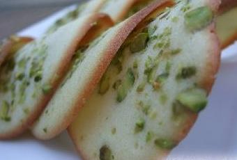 Déposer de petits tas de pâte sur une plaque anti-adhésive en les espaçant bien. Etaler un peu avec le dos d'une cuillère. Saupoudrer de pistaches concassées, enfourner pour 5 à 7 minutes.