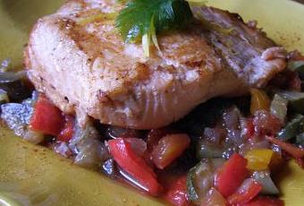 Dressez en premier la ratatouille, par dessus le filet de saumon et finir avec une pincée de piment d'Espelette.