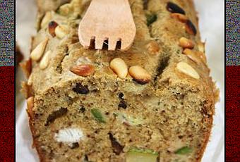 Mélanger et verser dans un moule à cake. Parsemer de pignons.