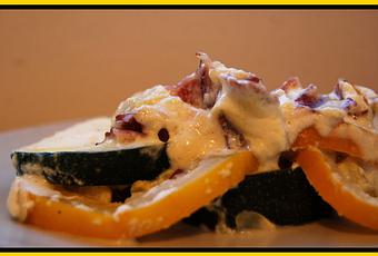 * Lavez et coupez la courgette en rondelles puis faites de petits carrés de jambon cru.