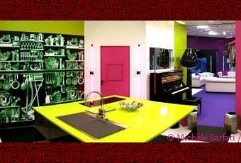 Dans la cuisine les couleurs fluorescentes dominent la pièce. L’armoire encastrée dans le mur est recouverte d’une impression numérique imitant les rayons X. Comme dans chacune des pièces de la maison, des mains tiennent des tubes lumineux . J’y vois les mains et les armes des guerriers Jedi, pas vous ?