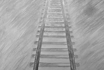 Pour mieux comprendre et tester ces effets, j’ai dessiné un chemin de fer. Normalement, je l’aurais dessiné croche, car je ne vois pas bien en vrai, que les rails horizontaux le reste, même au loin. Pour moi, ils sont croches. Bizarre non? Mais bon, voici mon essaie, que bien honnêtement, je trouve laid…. De plus, je n’ai pas réussi à créer un paysage autour, car je dessinais les arbres avec les mauvaises proportions et la mauvaise profondeur. Bref, c’est un essaie (et la photo est réellement mauvaise, je ne comprends pas ce qui s'est passé, grrrr!);