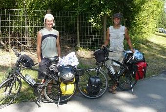 sur la route alors que je monte une longue cote ,j'aperçois dans mon rétroviseur, un vélo chargé qui me remonte à bonne allure, et me double bien sur dans pareil cas il y a une conversation qui s'engage avec des échanges d'adresses et des photos.donc c'est 2 jeune qui ont été faire un petit tour d'Europe en 5 mois et demi ils sont sur leurs derrières étapes et rentre sur Paris. il y en a un qui me demande si c'est normal que sa chaîne de vélo saute de temps a autre quand il force dans les cotes après un coup d'oeil il semble que la cassette et les plateaux soient fortement usée.je remarque aussi des rayons de cassés sur une roue avant le matériel a souffert. c'est des vélos de chez décathlon car leurs moyens financiers étaient limités.une bonne descente nous conduit a Pierrefonds, je les quittent devant le panneau d'entrèe de Pierrefonds, d'où je prends une photo pour mon BPFpuis je vais faire une visite du château qui est superbe .