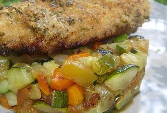 Sur une assiette, déposer un cercle, ajouter la préparation de légumes et y ajouter délicatement un filet de dinde pané aux herbes.