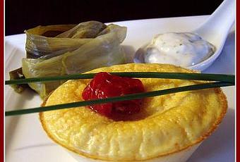 Dans un autre récipient, mélangez le lait tiédi avec la Maïzena et versez dans le blender. Salez et poivrez. Vous pouvez à ce moment-là ajouter quelques épices ou herbes aromatiques de votre choix. Mixez le tout quelques secondes. Versez dans le contenant beurré si celui-ci n'est pas en silicone. J'ai choisi des moules à muffins. Glissez au four pour 15 minutes pour des moules à muffins sinon il faudra prévoir un peu plus pour un moule à cake, il est conseillé 40 à 45 minutes dans la recette et selon votre four.