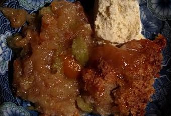 Éplucher la rhubarbe (inutile de la faire blanchir) et couper les fruits en morceaux, les déposer dans un plat beurré. Saupoudrer de sucre. Préparer la pâte en malaxant les ingrédients jusqu'à obtenir un mélange sableux. Déposer sur le dessus. Passer au four chaud à 180°C 25 minutes.