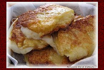 Pressez bien le tout et passez chaques "sandwichs" dans la farine, puis dans les oeufs battus avec du lait, du sel et du poivre. Quand le pain sera bien imbibé, égouttez-les et faites les dorer des 2 cotés dans une poêle avec de l'huile très chaude.