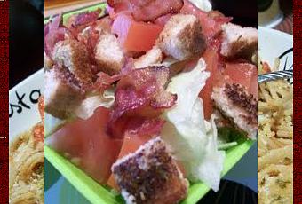 Vous aurez besoin pour un portion:1 tasse de laitue au choix (Moi boston et iceberg)1 tomate en dés3 tranches de bacon cuit1 tranche de painbeurre à l'ailVinaigrette dijon et mielDéposer la laitue dans un bol. Ajouter les tomates en dés et le bacon que vous aurez émietté. RéserverFaire griller la tranche de pain comme une rôtie (toast) . Beurrer la rôtie de beurre à l'ail. Couper le pain en petits cubes pour en faire des croûtons. Déposer les croûtons sur la salade et arroser de vinaigrette dijon et miel.C'est tout simple ;)