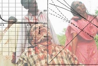- Si l’invasion s’étale dans le temps, alors là c’est la cata : l’effondrement de la civilisation. Tout les humains finissent infectés ou morts. Tout est lié à la natalité et à la mortalité humaine: « les naissances et morts d’êtres humains fourniraient aux morts vivants une source illimitée de nouveaux corps à infecter ou ressuciter… » (p. 146). La grande force des zombies tels qu’ils sont modélisés ici, c’est qu’ils peuvent puiser dans le stock de cadavres, contrairement à d’autres scénarios d’épidémies.