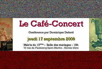 "Un lieu où l'on ne boit jamais de café et où il n'y a jamais de concert..." Entre 1850 et la Belle Epoque Dominique Delord, chercheuse dans des thèmes culturels,organisatrice de concerts et de conférnces, elle a notamment écrit joué et chanté avec Serge Hureau et Cyrille Lehn : Monthéus chanteur du peuple ( Hall de la Chanson production, 2007-2008). Cette conférence est présentée par l'association Histoire et Vies du 10°, dans le cadre des manifestations : "Ensemble nous sommes le 10°". Le spectacle sera accompagné de la projection d'images rares et de chansons anciennes. L'entrée est libre. Mairie du 10° arrondissement, 72 rue du faubourg Saint-Martin 75010 jeudi 17 septembre 2009 à 19 heures