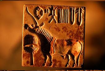 Un sceau Harappéen de licorne, datant de 2400 av. J.-C, de la civilisation de la Vallée de l'Indus antique qui s'étend à travers la partie de ce qu'est maintenant l'Inde moderne et le Pakistan. Depuis les années 1920, des dizaines d'expéditions archéologiques ont mis au jour les traces d'une culture urbaine vieille de 4500 ans et couvrant près de 500.000 km² dans l'actuel Pakistan et nord-ouest de l'Inde.