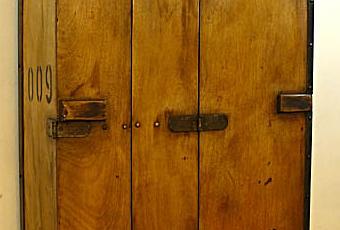 009_Box - Meuble de rangement réalisé à partir d'une grande caisse de transport mise à la verticale et aménagée. Ajout de pieds, de deux étagères, d'un coffre avec 2 trappes sur le dessus. Renforts extérieurs en acier. Matériaux et finitions : Patine du bois à la cire et pigments , Acier brossé et ciré. Hauteur : 123 cm. Largeur : 80 cm. Profondeur : 42 cm.