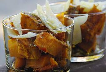 Pour cette entrée, utiliser la recette de potimarron rôti réalisée précédemment...ensuite, un peu de parmesan, un peu d'huile d'olive, du vinaigre balsamique et si besoin, un peu de sel et de poivre. A manger tiède...