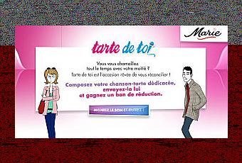 C’est la marque de plats cuisinés Marie qui en est à l’origine. Marie a lancé Tarte de toi pour les internautes. En cliquant sur une espèce de jukebox qu’on dirait croisé avec une cuisinière, ils peuvent créer… une histoire. En fait une chanson personnalisée, mais bon, une chanson raconte le plus souvent une histoire.