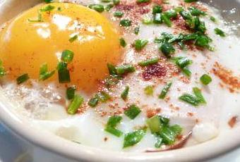 8/A la sortie du four, ajouter du paprika et de la ciboulette sur l’oeuf.