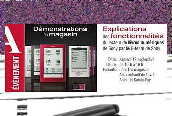 Les lecteurs, ça peut se découvrir aussi dans les librairies! Archambault, qui vient d'ouvrir JeLisNumérique au Québec propose le week-end prochain des démonstrations autour des lecteurs de livres numériques de Sony. C'est pour quand chez Dialogues à Brest?Magazine Conso