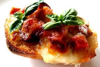 Mettre quelques gouttes d'huile sur le pain, le frotter avec la gousse d'ailDéposer les morceaux de tomates, les morceaux de chorizo, sur le pain et sur le dessus une tranche de mozarellaPréchauffer le four à 210°Y mettre les crostinis pour environ 10 minutes, le fromage doit avoir une belle couleur dorée