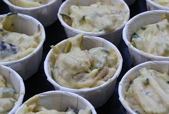 Puis on ajoute la garniture, et on obtient un appareil assez épais. Et on remplit des moules :