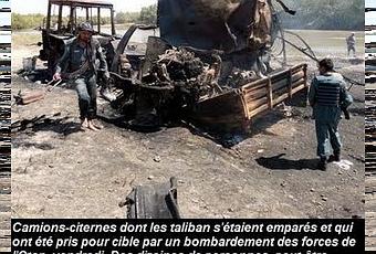 Jusqu'à 90 personnes ont été tuées vendredi dans le nord de l'Afghanistan dans le bombardement de citernes de carburant par les forces internationales, le nombre encore incertain de civils parmi elles victimes poussant l'ONU, l'OTAN et Kaboul à promettre des enquêtes.L'armée allemande, qui dirige les opérations militaires de l'OTAN dans cette province de Kunduz, avait d'abord assuré que le bombardement, qui visait deux camions citerne volés par les talibans, n'avait tué que des insurgés et aucun civil. Puis un de ses porte-parole à Berlin a tempéré en précisant que la Bundeswehr n'en n'était pas sûre à «100%».