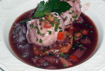 - un gros oignon, une carotte, un bouquet garni, 100 g de poitrine de porc demi-sel, une échalote grise, trois gousses d’ail, deux bonnes cuillerées de farine, 50 g de beurre, sel, poivre, de fines tranches de pains rassis, une huile neutre, du beurre.