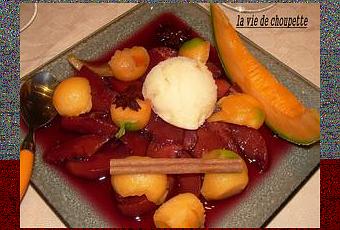 3/ Egouttez délicatement les pêches avec une écumoire et disposez une dizaine de tranches par assiette. Arrosez de vin aux épices. Placez une boule de sorbet sur les pêches. Décorez de badiane, d'un bâton de cannelle et d'un brin de verveine.
