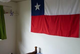 Voilà le drapeau du Chili. Moi je le trouve joli. En ce moment ils fleurissent dans toute la ville: la fête nationale étant le 18 septembre, il en mettent sur leur voiture, à leur maison et on voit plein de vendeurs dans la rue qui en proposent. Moi j'en ai acheté un grand pour décorer ma chambre comme vous pouvez le voir...
