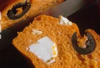 70g d'olives noires - 70g de concentré de tomates - 200g de farine - 1 sachet de levure chimique - 3 oeufs - 10cl de lait - 1 bocal de feta aux fines herbes (environ 300/400g)
