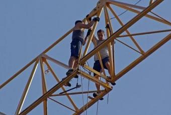 Quel nom peut-on donner à la profession de ces 2 ouvriers? Equilibriste, cascadeur, acrobate, kamikaze ? Tutoyer le ciel pour monter et démonter des mastodontes de ferrailles. Côtoyer les animaux qui volent. Dominer la ville. S’élever plus haut que le commun des mortels. Déjouer les lois de la gravitation et défier celles du vertige. Un métier dangereux qui demande un sang froid, un savoir faire, beaucoup d’adresse, une technique et une hygiène de vie exemplaire. Dans l’univers des cieux, il n’y a pas de place à l’erreur. Le grand écart c’est pour les autres. Le faux pas aussi. La chute est un tabou. L’approximatif est banni comme les faux calculs. La première bourde conduit à la morgue. On n’a pas droit à une seconde chance ou à un quelconque repêchage. Généralement c’est un travail de tandem. A deux dangereusement ! Risque doublé, responsabilité accrue. Une vie en vaut deux et deux en valent une. Leur destin est intimement lié. Equilibristes sans filet, cascadeurs au réel, acrobates entre ciel et terre ils mettent leur vie en péril pour le bien être des autres, le notre. Ces travailleurs du risque méritent estime et encouragement. Quel nom peut-on donner à leur profession ? Techniciens de haut vol. Leur lieu de travail : le grand vide.