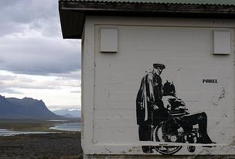 Du street art en pleine nature!! J'ai en effet découvert une oeuvre de Pobel la ou je m'y attendais le moins, on sortait tout juste de la peninsule de Snaefellness, endroit désert et assez sauvage avec son glacier, ses cotes sauvages et ses cratères quand au détour d'un virage, sur une petite cahute en haut d'une colline, nous tombons sur ce stencil signé Pobel, street artiste norvégien.