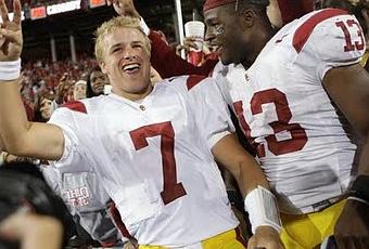 -Parlant des Trojans, une autre belle sortie du jeune Freshman, Matt Barkley. Le Kid vient tout juste de fêter ses 19 ans et il est en train de devenir tout un quart dans un énorme programme de football. Ses statistiques sont peu éloquentes (15/31, 195 vgs, 1 int), mais le gars à réussi toute une dernière séquence pour remonter le terrain et permettre à USC de se sauver avec la victoire. C’est à se demander si l’entraîneur des Trojans, Pete Carroll, n’a pas un don pour trouver et former les quart-arrières. Depuis le début des années 2000, il a dirigé: Carson Palmer (Heisman winner), Matt Leinart, Mark Sanchez, il a fait bencher Matt Cassel pendant 4 ans et voici maintenant Matt Barkley. La seule chose que je peux souhaiter à Barkley, c’est d’avoir plus de chance dans les pros que les 2 Matt qui sont passés avant lui.