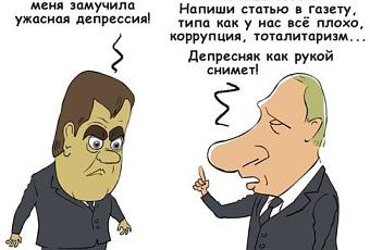 Les critiques se font aussi en vidéo (version Roulitiki) ou en dessin (comme celui de Sergueï Elkin qui illustre cet article où Medvedev dit : "En ce moment, je subis une horrible dépression" et Poutine lui répond : "Tu veux un conseil ? Ecris un article dans un journal, disant que tout va mal chez nous, corruption, totalitarisme, ... Et la dépression disparaîtra comme par magie !").