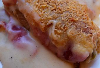 * Disposez une couche de béchamel dans le fond d'un plat à four puis chaque endive enroulée dans une tranche de jambon, recouvrez du reste de béchamel.