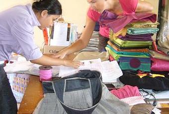 Sandy Blain, créatrice de la marque "La Vie devant Soie" en compagnie d'une couturière dans l'atelier au Cambodge.